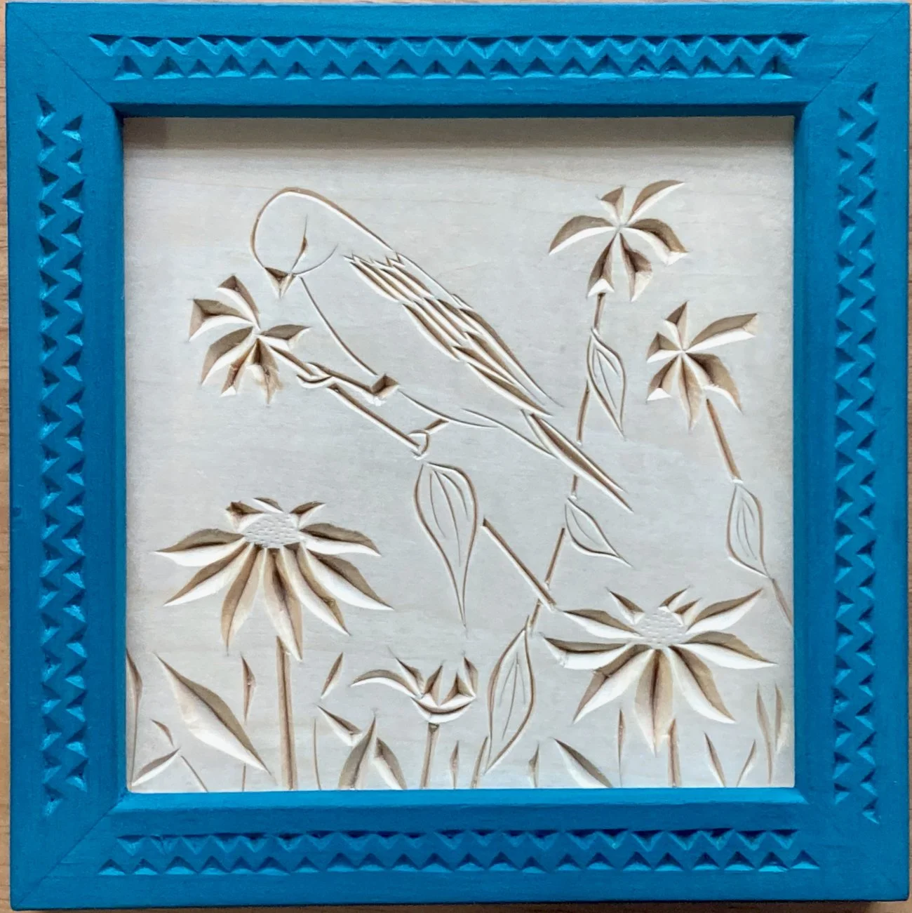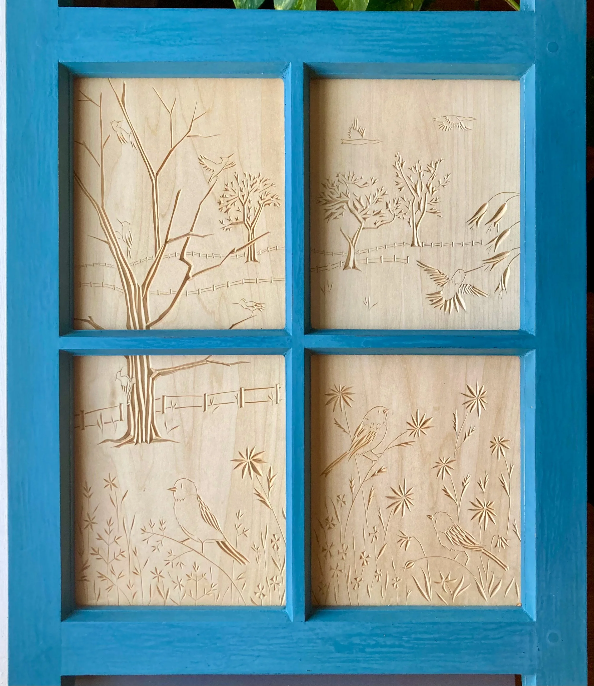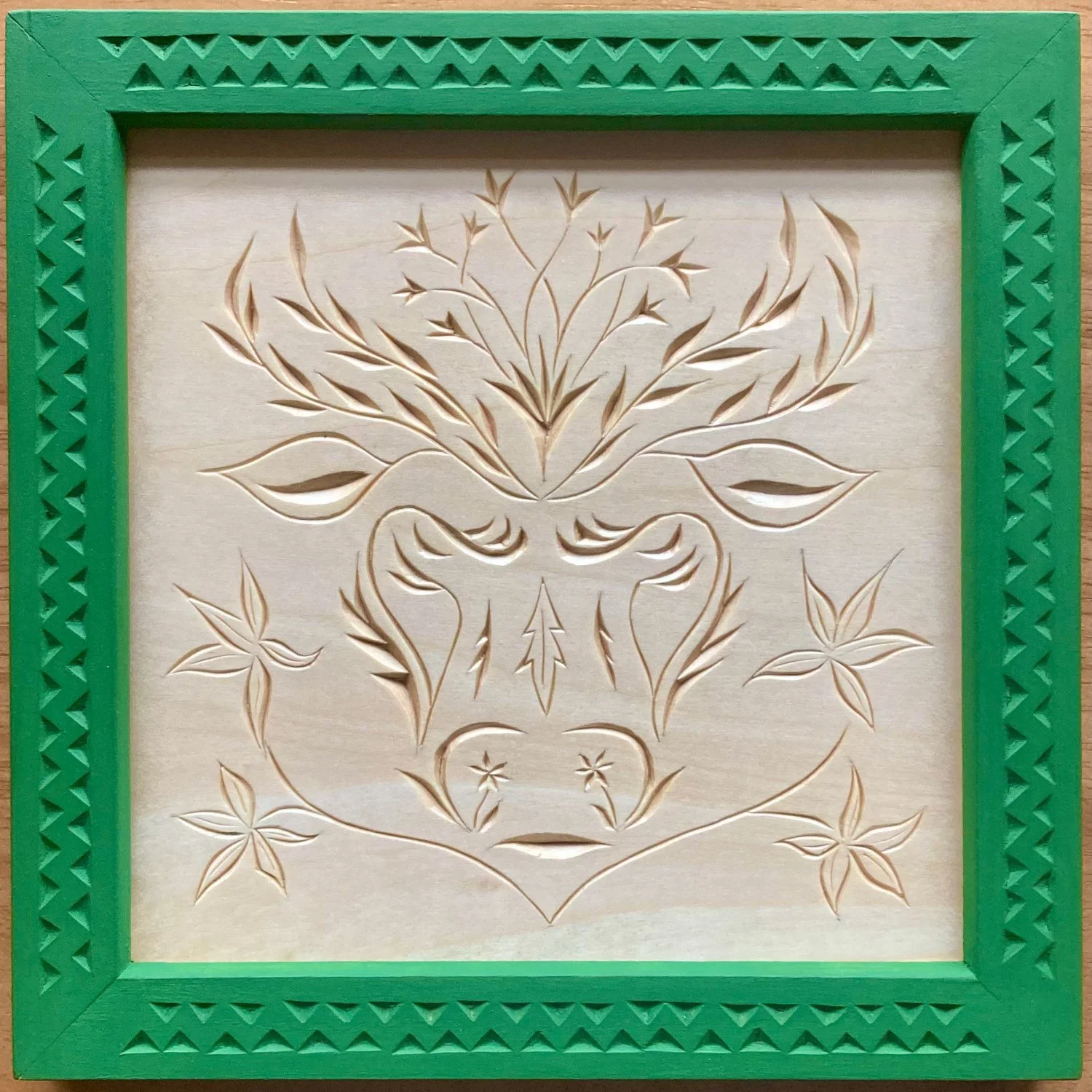 The work below is a sample of what I’ve completed in 2024 and ‘25. All carvings are executed in basswood with chip-carving knives and finished with shellac. Frames for single carvings are similarly chip-carved, then finished with milk paint and oil and/or beeswax. Frames for polyptychs are hand-made with traditional mortise-and-tenon joinery and variously finished.