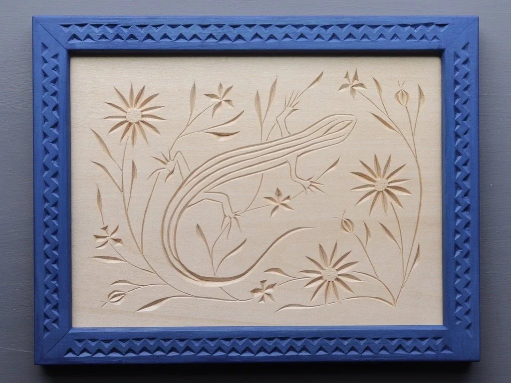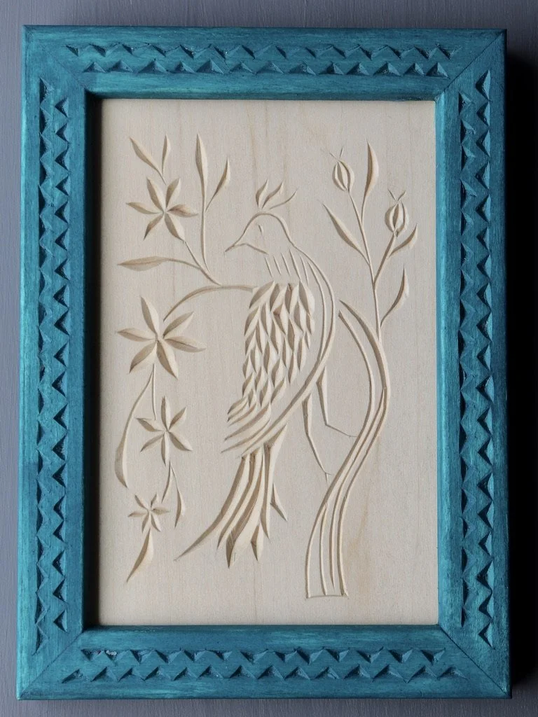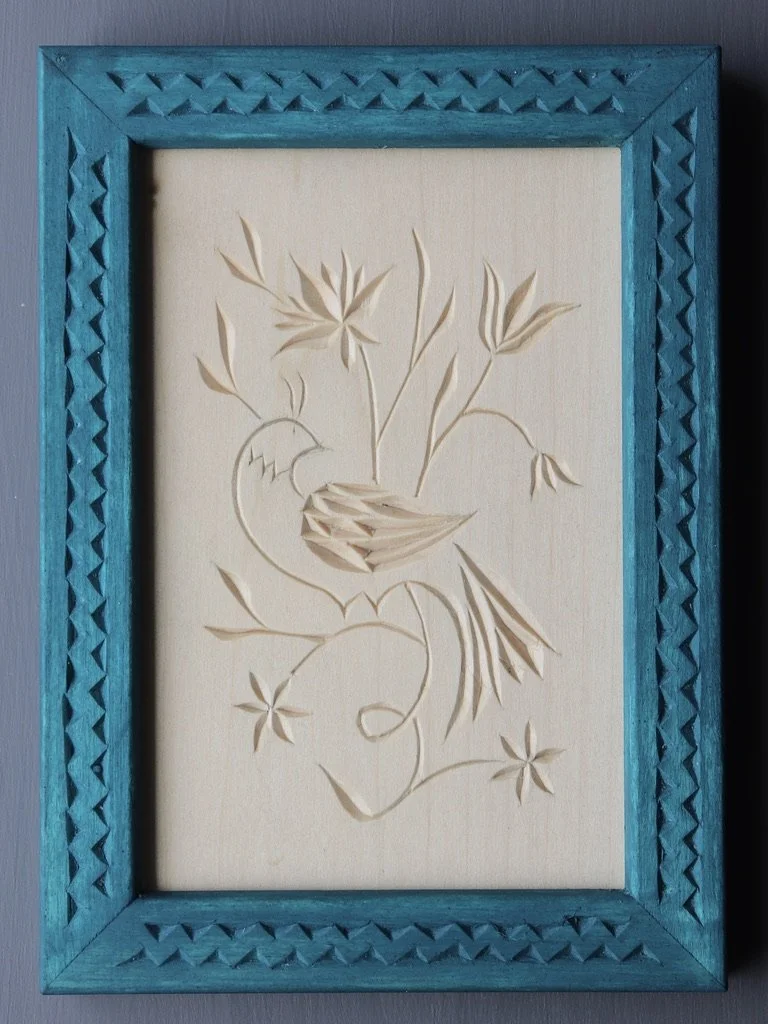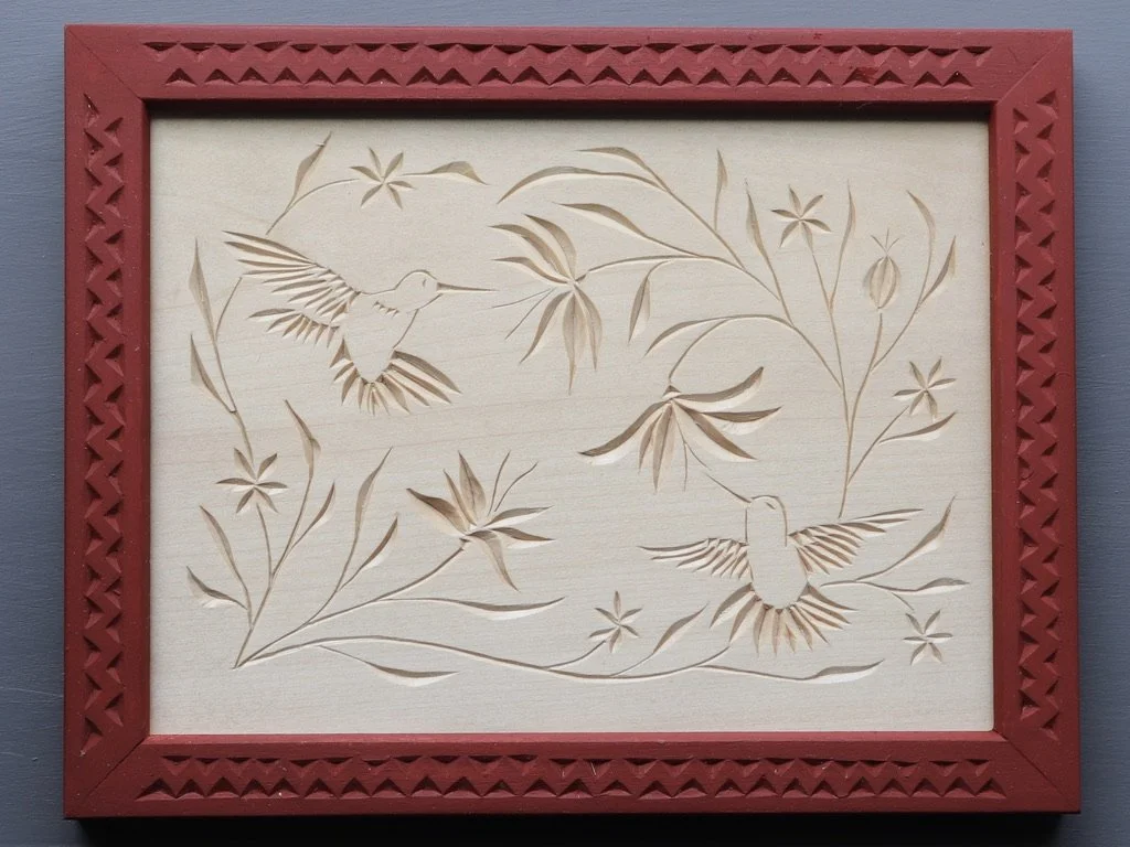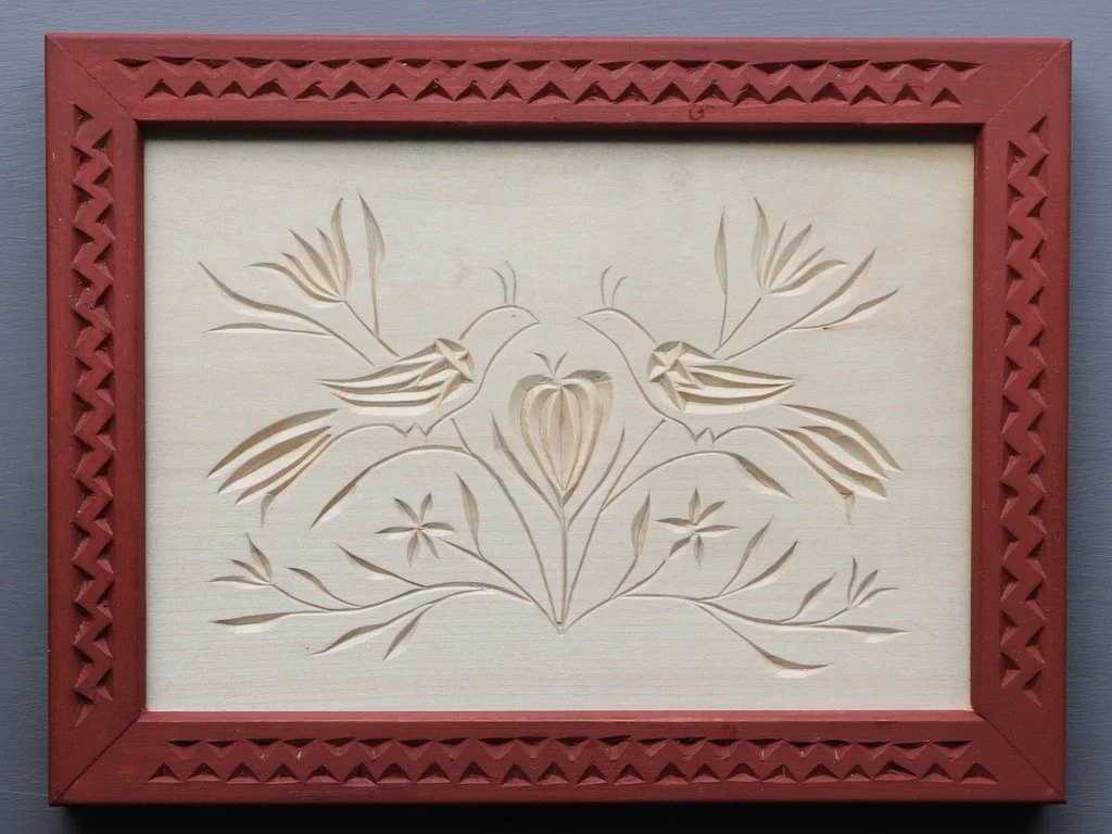 I carve these designs in thin sheets of basswood using a chip-carving knife, then finish them with thin coats of shellac. The frames are carved with simpler patterns for contrast, painted milk paint, and finished with walnut oil and beeswax.