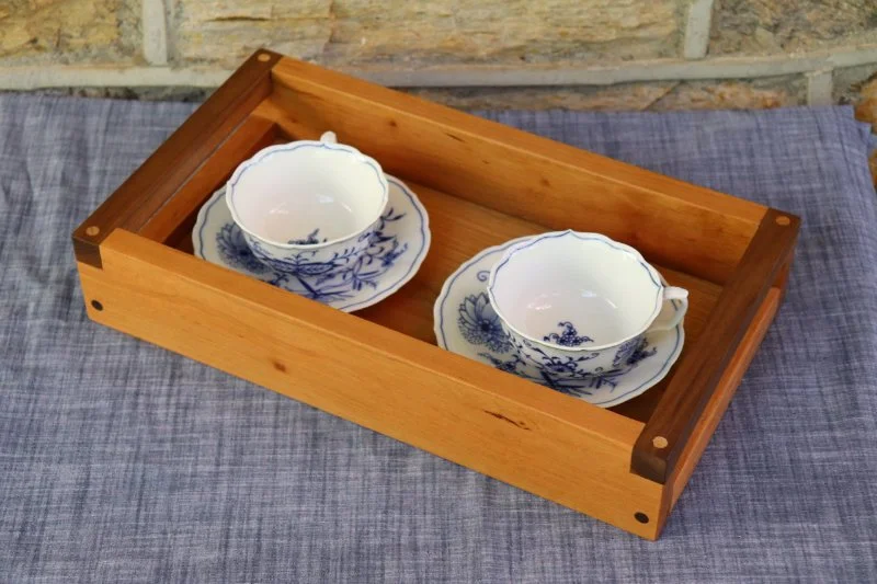 I designed this tray as a graduation present for my daughter, to accommodate a pair of antique cups and saucers. Cherry, walnut, and ash accents, 2021. Finished with Osmo Polyx Oil, a zero-VOC finished designed for hardwood floors, for scratch and water resistance.