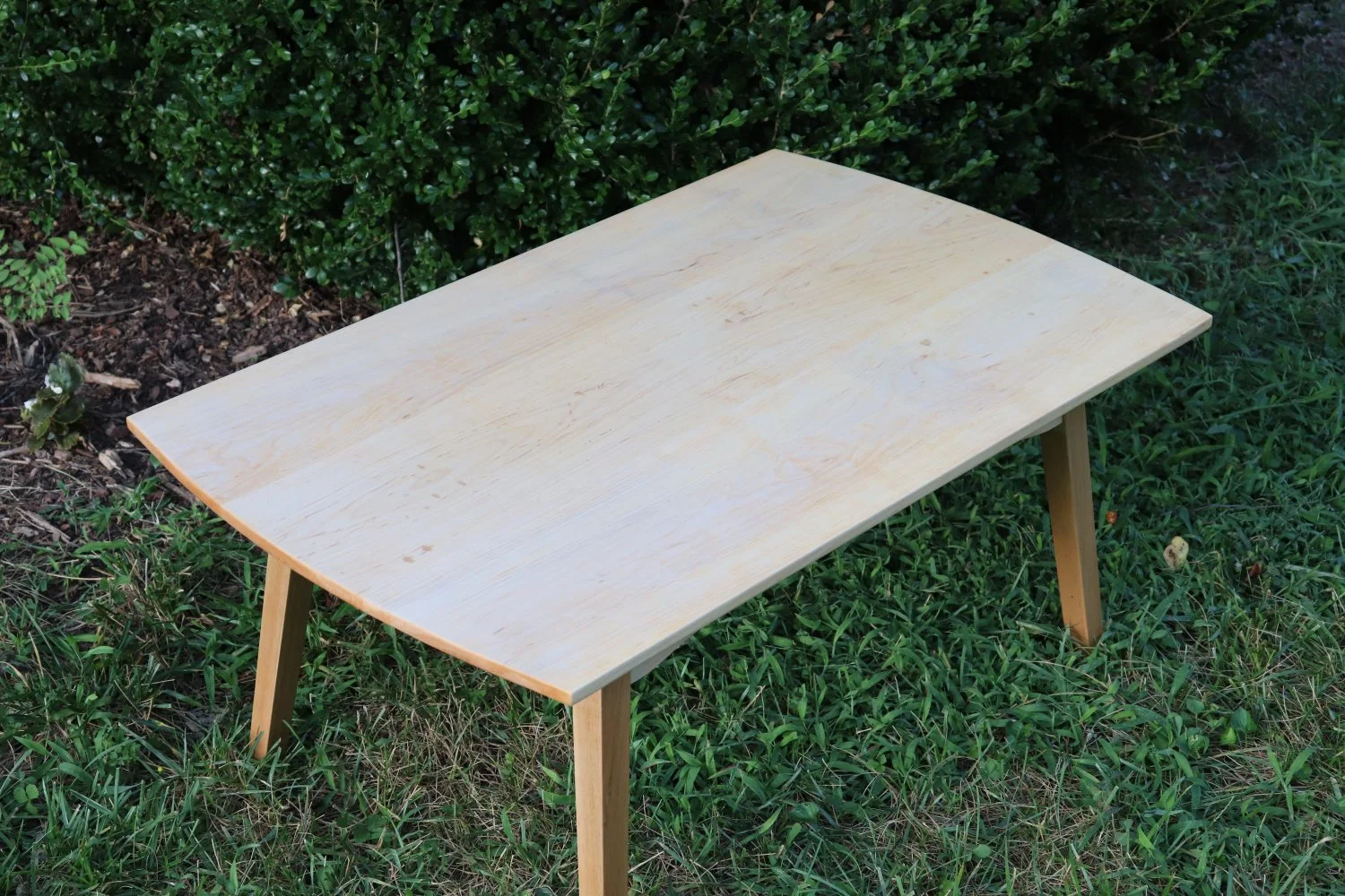 This table, by contrast, is full-on mid-century modern in design, though its construction is traditional. The gentle arch of the apron flows into and accentuates the movement of the angled legs, and is echoed by the tabletop’s curved ends. The mortise-and-tenon joints are drawbored and pinned. Red maple, 2019.