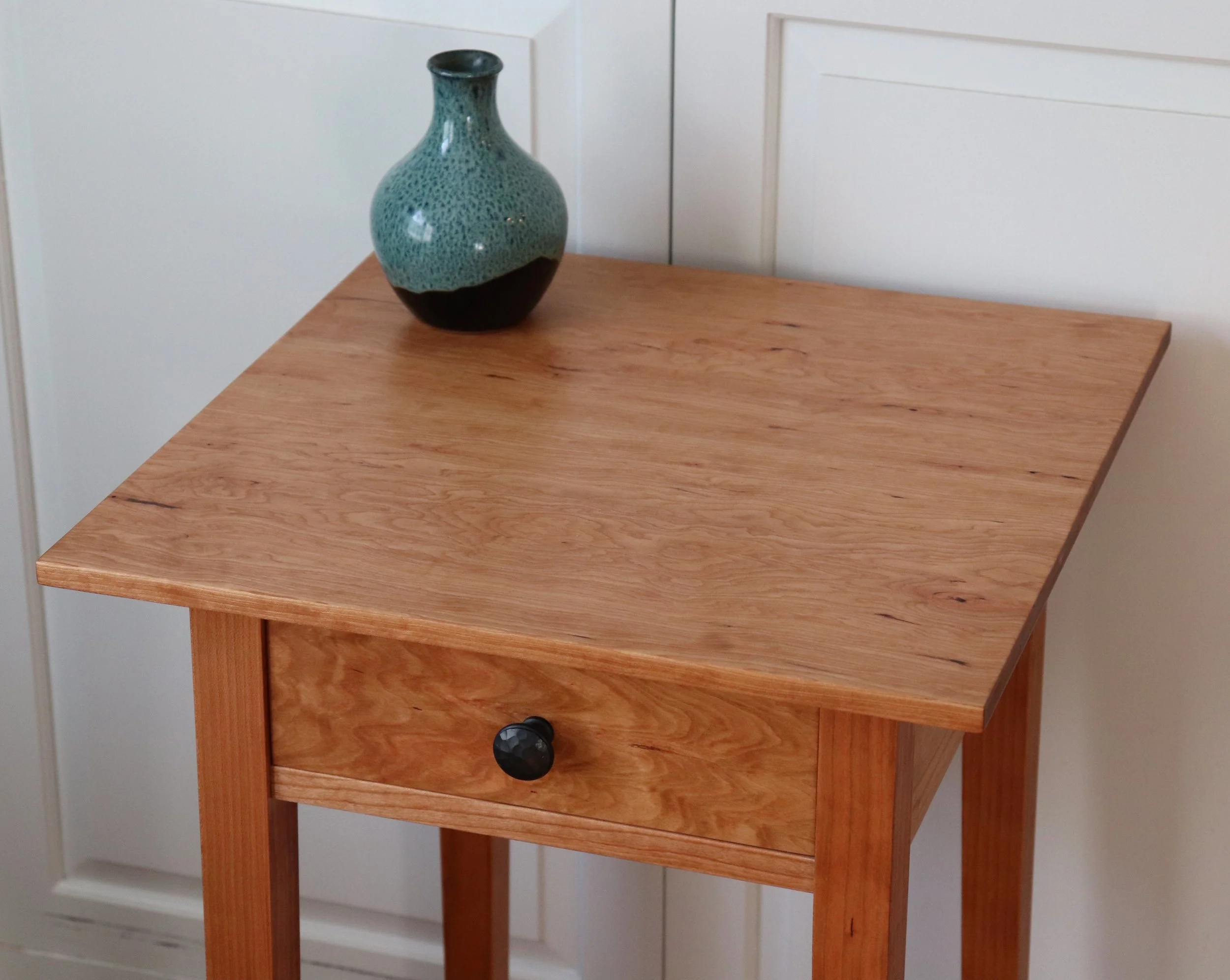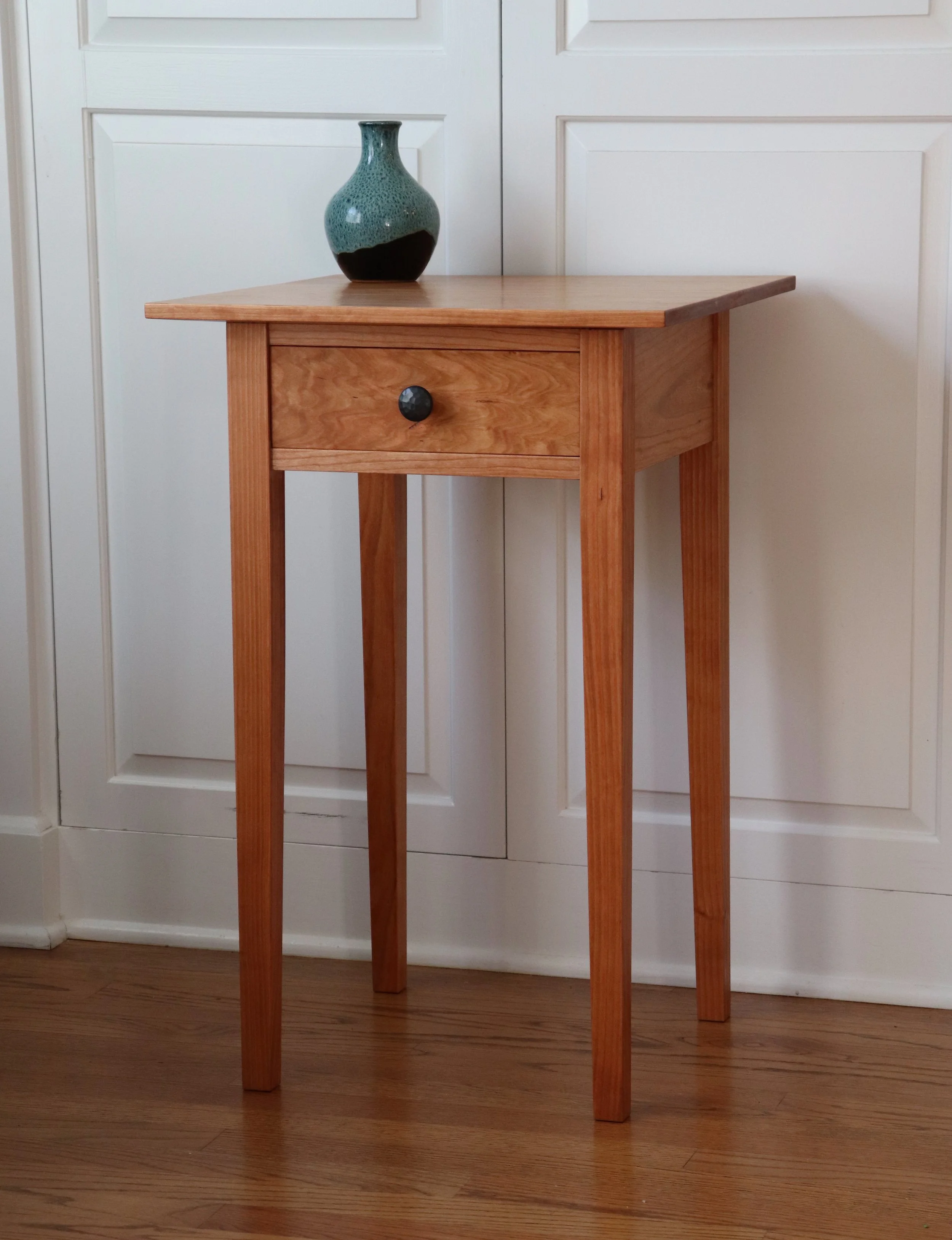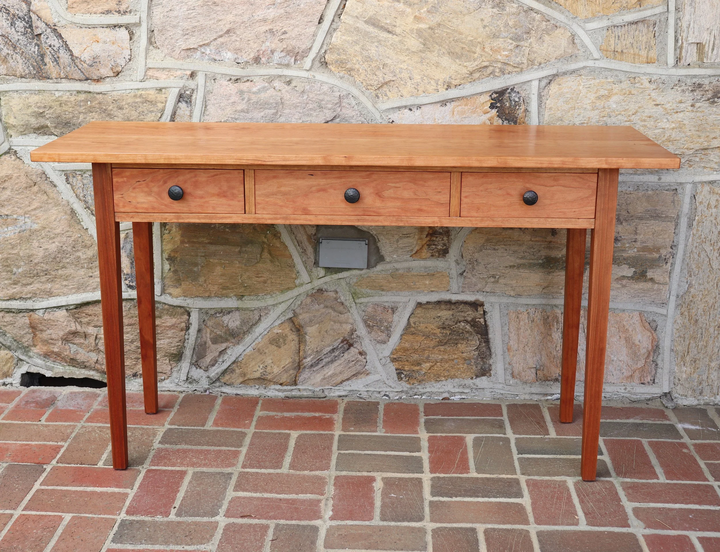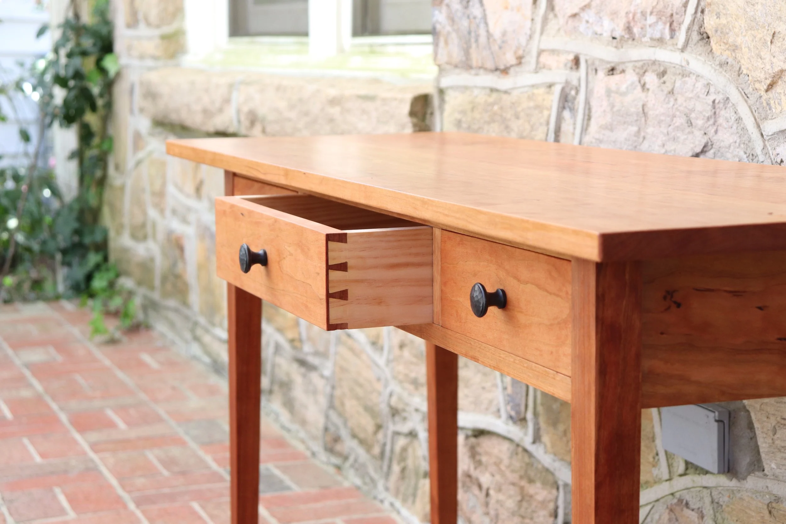 Tables after the simple style of nineteenth-century Shakers, though my sense of Shaker style is filtered through the work of modern craftsmen like Christian Becksvoort. The one-drawer side table is a standard; the three-drawer console was a more challenging build (there’s more under the hood than you may think!).